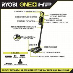 18V ONE+ HP CORDLESS PET STICK VAC KIT WITH DUAL-ROLLER BAR RYOBI 4FRR0552 Cleaning