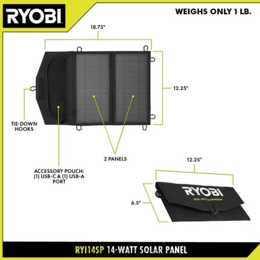 The RYOBI 14 Watt Foldable Solar Panel powers any small electronic device with a USB-A or USB-C port directly from the sun. It is ideal for powering your phones, tablets, power banks, speakers, and even your RYOBI 18V ONE+ batteries when combined with a compatible RYOBI power source. It can charge a RYOBI 18V ONE+ 2Ah battery in under 4 hours and your phone in as little as 2 hours and 20 minutes. The 14 Watt solar panel maximizes your power source portability, weighing in at only 1 pound and measuring 12.15”x 6.5” when folded. The compact, lightweight, foldable design makes storing and transporting easy, so you can take it with you to charge devices when hiking, camping, at the beach, and anywhere under the sun where you’d need portable power. It can be opened up flat on the ground to capture light during peak sunlight hours, or can be strung up at a variety of angles using the (7) integrated hanging loops to maximize the amount of light it captures. The RYOBI 14 Watt Solar Panel is backed by the RYOBI 3-Year Manufacturer’s Warranty and includes the RYi14SP 14 Watt Foldable Solar Panel and an Operator’s Manual.