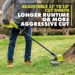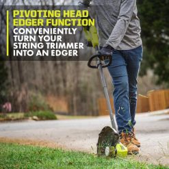 Enter the RYOBI 18V ONE+ System with the 18V ONE+ 13” String Trimmer/Edger Kit. The powerful motor allows you to tackle weeds around medium sized yards with extended runtime. Experience exceptional performance with just the pull of a trigger. Achieve a longer runtime or more aggressive cut with the adjustable 11” to 13” cut swath. The auto-feed head reloads string and advances line with each pull of the trigger. For ultimate convenience, turn your string trimmer into an edger for clean, precise cuts around your sidewalks and driveways with the pivoting head edger function. For more control while trimming along fences, mailboxes, and flower beds, utilize the variable speed trigger. This 18V ONE+ 13” String Trimmer/Edger Kit is backed by the RYOBI 3-Year Manufacturer’s Warranty and includes P20018 18V ONE+ 13″ String Trimmer/Edger, PBP005 18V 4Ah Lithium Battery, PCG002 18V Charger, Grass Deflector, Front Handle, and Operator’s Manuals.