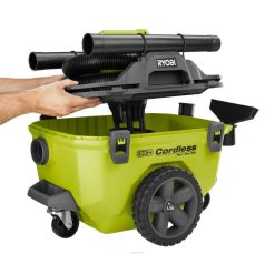 Introducing the new RYOBI ONE+ 6 Gal. Wet/Dry Vacuum. Now, you can experience corded performance with cordless convenience. This vacuum has a powerful 80 CFM. The multi-size no-tip wheel design and 360 degree mobility keeps your vacuum balanced when rolling over cords and thresholds. On-board accessory storage conveniently holds your crevice tool, floor nozzle and extension wands, while the hose dock provides a simple solution to storing your hose when not in use. Multiple carrying handles allow for easy carrying, and the removable top makes emptying dust, debris and liquids quick and mess-free. The compact design allows for space-saving storage when not in use. Best of all, the RYOBI ONE+ wet/dry vacuum is part of the RYOBI ONE+ family of over 100 tools.
