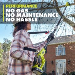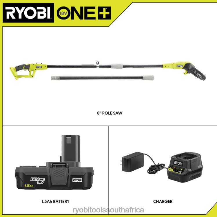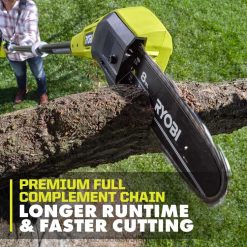 Expand your RYOBI 18V ONE+ System with the 18V ONE+ 8” Pole Saw Kit. The 8” bar and chain and powerful motor tackles branches up to 6”, making it ideal for pruning and limbing. With up to 16 cuts per charge and a premium full complement chain, the pole saw delivers longer runtime and faster cutting. Experience exceptional performance with just the pull of a trigger, without the hassle of gas or cords. Achieve precise cuts with the angled head, 9.5′ extension, and in-line motor. For user convenience, it has an oil-free design, tooled chain tensioning, and on-board tool storage. It’s compatible with the RY8C1 8″ Replacement Chain. Best of all, it is part of the RYOBI ONE+ system where any 18V ONE+ battery works with any 18V ONE+ product. This 18V ONE+ 8in Pole Saw is backed by the RYOBI 3-Year Manufacturer’s Warranty and includes 18V 1.5Ah Battery, 18V Charger, Handle Pole, Intermediate Pole, Combination Wrench, Scabbard, Shoulder Harness, and Operator’s Manuals.