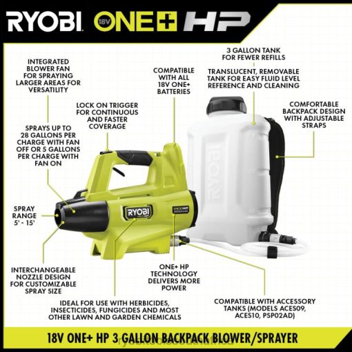 Conveniently spray around your yard with the RYOBI 18V ONE+ HP Brushless 3 Gallon Backpack Blower/Sprayer. This sprayer is equipped with an integrated blower fan for spraying larger areas for versatility. The ONE+ HP Technology delivers more power allowing you to spray up to 28 gallons per charge with the fan off or 5 gallons per charge with the fan on with a RYOBI 18V ONE+ 2Ah battery. With a spray range of 5 ft. to 15 ft., you can spray those hard to reach areas. Customize the spray size with the interchangeable nozzle design and utilize the included nozzle-removal tool for quick nozzle changes. The 3 gallon tank is perfect for spraying larger areas, and you can easily reference the fluid levels with the translucent design. To allow for convenient, continuous, and fast coverage this sprayer has a lock on trigger as well as a comfortable backpack design with adjustable straps. It is ideal for use with herbicides, insecticides, fungicides, and most other lawn and garden chemicals. This kit is equipped with an 18V ONE+ 2.0 Ah battery and charger. The battery is compatible with the RYOBI 18V ONE+ system. The RYOBI 18V ONE+ HP Brushless 3 Gallon Backpack Blower/Sprayer kit is compatible with any RYOBI 18V battery. It is backed by a 3-year tool warranty.