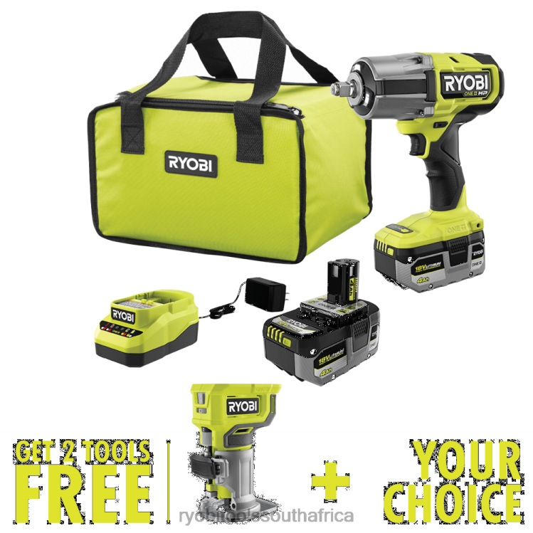 RYOBI introduces the 18V ONE+ HP Brushless ” High Torque Impact Wrench Kit with FREE 18V ONE+ Compact Router and FREE select tool of choice. ONE+ HP Technology delivers more power, runtime, durability and speed utilizing brushless motors, advanced electronics and high performance lithium technology. This wrench features a brushless motor delivering up to 1,170 ft-lbs. of breakaway torque and 7X faster removal speed to excel in demanding applications. The 4-Mode control board provides low/medium and high speeds while Auto Mode prevents overtightening in forward and controlled removal in reverse. The die cast gear case has a greater durability in the harshest work environments. This impact wrench is designed with efficiency in mind, the anvil with friction ring provides quick socket changes and the Tri-Beam LED worklights allow for clear workspace visibility. This partnership of power and performance make this the perfect solution for any automotive shop. Part of the RYOBI ONE+ System – Any 18V ONE+ Battery Works with Any 18V ONE+ Product. This 18V ONE+ HP Brushless 4-Mode 1/2 in. High Torque Impact Wrench Kit is backed by the RYOBI 3-Year Manufacturer’s Warranty and includes PBLIW01 18V ONE+ HP Brushless 4-Mode 1/2” High Torque Impact Wrench, (2) PBP004 18V ONE+ 4Ah Lithium HIGH PERFORMANCE Batteries, Charger, Bag, and operator’s manual with FREE PCL424 18V ONE+ Compact Router and FREE select tool of choice.