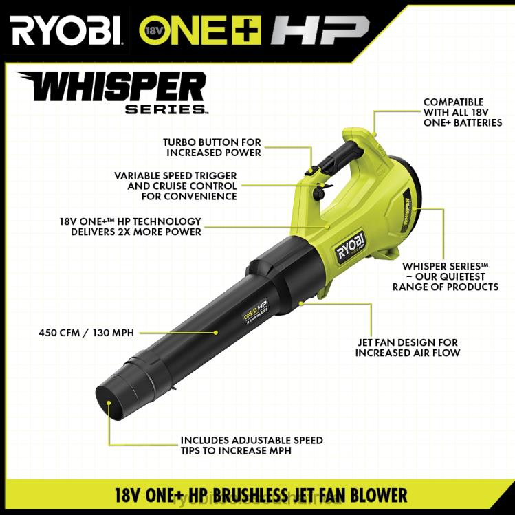 18V ONE+ HP BRUSHLESS WHISPER SERIES 450 CFM BLOWER KIT RYOBI 4FRR0310 Outdoor