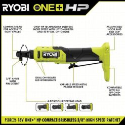 Enhance your RYOBI 18V ONE+ System with the 18V ONE+ HP Compact Brushless 3/8” High Speed Ratchet. ONE+ HP Technology delivers more power, runtime, durability and speed utilizing brushless motors, advanced electronics and HIGH PERFORMANCE lithium technology. Our compact tools are the lightest and smallest we have ever made, while still delivering optimal power to get the job done. Ideal for any auto enthusiast or pro technician, this ratchet is capable of 2X higher speed delivering up to 460 RPM. Pair that with 40 ft-lbs. of torque, this tool becomes the ultimate time saver when completing repetitive tasks, leading to faster project completion. Featuring a 20% more compact 4-position rotating ratchet head with dual on-board LED worklights, this ratchet can reach any nut or bolt in an illuminated workspace. The variable speed metal paddle trigger is easily accessible from a variety of grips and angles. This 18V ONE+ HP Compact Brushless 3/8” High Speed Ratchet is backed by the RYOBI 3-Year Manufacturer’s Warranty and includes (1) PSBRC26 18V Compact Brushless 3/8” High Speed Ratchet and Operator’s Manual. Best of all, it is part of the RYOBI 18V ONE+ System of over 260 Cordless Products that all work on the same battery platform. 2 Ah Battery and charger included.