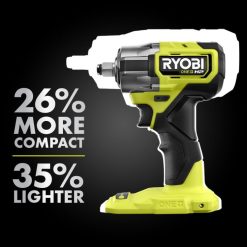 Enhance your RYOBI 18V ONE+ System with the RYOBI 18V ONE+ HP Compact Brushless 4-Mode 1/2″ Impact Wrench. ONE+ HP Technology delivers more power, runtime, durability and speed utilizing brushless motors, advanced electronics and high performance lithium technology. Our compact tools are the lightest and smallest we have ever made, while still delivering optimal power to get the job done. Measuring in at only 5.4″ in long, this tool is 26% more compact and 35% lighter weight while still delivering exceptional torque. The 1/2″ wrench is compatible with all 1/2″ impact rated sockets. This tool delivers up to 275 ft-lbs. of breakaway torque ensuring users are able to remove stubborn bolts. The on-board speed control has 4-modes – high, medium, low and a unique Auto Mode that prevents overtightening and controlled removal in compact applications such as removing brake pads in a wheel well. Tri-Beam LED worklights that allow for clear workspace visibility while the die cast gear case provides greater durability in the harshest work environments. The 1/2″ anvil with friction ring allows quick and secure socket changes limiting user downtime. This 18V ONE+ HP Compact Brushless 4-Mode 1/2″ Impact Wrench is backed by the RYOBI 3-Year Manufacturer’s Warranty and includes (1) PSBIW25B 18V ONE+ HP Compact 4-Mode 3/8″ Impact Wrench and Operator’s Manual. Battery and charger sold separately.