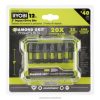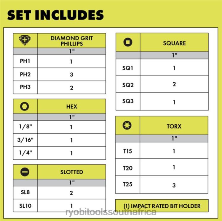 Compliment your tool collection with RYOBI Diamond Grit Coated Technology. These 22 PC. 1″ Impact Drive Bits include diamond coated impact Phillips bits and additional impact rated drive bits. The Diamond Grit Coated Technology provides an additional layer of protection for 20X longer life, improving the bit durability across all Phillips screw driving applications. Diamond Grit produces a 2X stronger grip which allows for a strong pre-driving hold and seating of the fastener into the bit. This added grip creates a similar experience as a magnetically charged bit, but with a more secure hold. The Diamond Grit Coated Technology grabs into the Phillips fastener during driving applications for better fitment to prevent stripping of the Phillips head. This set offers a wide variety of driving solutions that can handle the pro and DIYer needs. These 22 PC. 1″ Impact Drive Bits are compatible with standard drills and impact drivers and include (1) Impact Mag. Bit Holder, (1)1″ Diamond PH1, (3) 1″ Diamond PH2, (2) 1″ Diamond PH3, (1) T15, (1) T20, (3) T25, (1) HEX 1/8″, (1) HEX 3/16″, (1) HEX 1/4″ , (2) SL8, (1) SL10, (1) SQ1, (2) SQ2, and (1) SQ3.