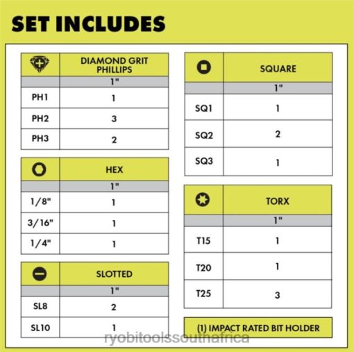 Compliment your tool collection with RYOBI Diamond Grit Coated Technology. These 22 PC. 1″ Impact Drive Bits include diamond coated impact Phillips bits and additional impact rated drive bits. The Diamond Grit Coated Technology provides an additional layer of protection for 20X longer life, improving the bit durability across all Phillips screw driving applications. Diamond Grit produces a 2X stronger grip which allows for a strong pre-driving hold and seating of the fastener into the bit. This added grip creates a similar experience as a magnetically charged bit, but with a more secure hold. The Diamond Grit Coated Technology grabs into the Phillips fastener during driving applications for better fitment to prevent stripping of the Phillips head. This set offers a wide variety of driving solutions that can handle the pro and DIYer needs. These 22 PC. 1″ Impact Drive Bits are compatible with standard drills and impact drivers and include (1) Impact Mag. Bit Holder, (1)1″ Diamond PH1, (3) 1″ Diamond PH2, (2) 1″ Diamond PH3, (1) T15, (1) T20, (3) T25, (1) HEX 1/8″, (1) HEX 3/16″, (1) HEX 1/4″ , (2) SL8, (1) SL10, (1) SQ1, (2) SQ2, and (1) SQ3.