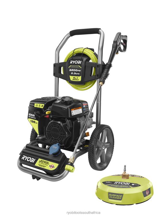 The RYOBI 3200 PSI Pressure Washer with 15 in. Surface Cleaner is the perfect combination to get the toughest jobs done quickly. The powerful Kohler 196cc Engine delivers 3200 PSI of force to blast away dirt, grime, oil, and other stains. The durable hand truck frame and 12 in. wheels make transportation easy. The 35 ft. non-marring high pressure hose provides 40% longer reach needed to clean areas that are difficult to access. The on-board detergent tank offers hassle-free cleaning by eliminating the need to drag a bucket and hose behind you. For added convenience, it is equipped with a 5-in-1 quick change nozzle, which allows you to quickly change spray patterns. When cleaning hard surfaces like driveways, patios, and sidewalks, use the 15 in. Surface Cleaner. This time saving accessory cleans up to 5X faster than a standard nozzle, with rotating jets that give you a large, streak-free cleaning path. The RYOBI 3200 PSI Gas Pressure Washer is backed by a 3-year limited tool warranty and a 3-year engine warranty.