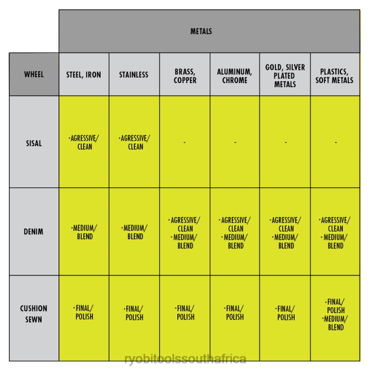 Compliment your tool collection with the 4 PC. 4″ Buffing and Polishing Wheel Set. These buffing wheels can be used for multiple stages of the buffing process and can be used on a variety of metals. These wheels are compatible with bench grinders and drills and impact drivers with the included mandrel. For best results use with the RYOBI Metal Cleaning Compound Set. This set includes (1) Sisal Wheel, (1) Denim Spiral Wheel, and (1) Cushion Sewn Wheel and (1) 1/4″ Hex Shank Mandrel.