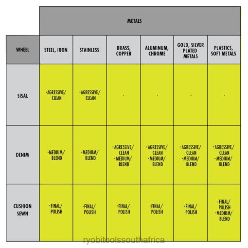 Compliment your tool collection with the 4 PC. 4″ Buffing and Polishing Wheel Set. These buffing wheels can be used for multiple stages of the buffing process and can be used on a variety of metals. These wheels are compatible with bench grinders and drills and impact drivers with the included mandrel. For best results use with the RYOBI Metal Cleaning Compound Set. This set includes (1) Sisal Wheel, (1) Denim Spiral Wheel, and (1) Cushion Sewn Wheel and (1) 1/4″ Hex Shank Mandrel.