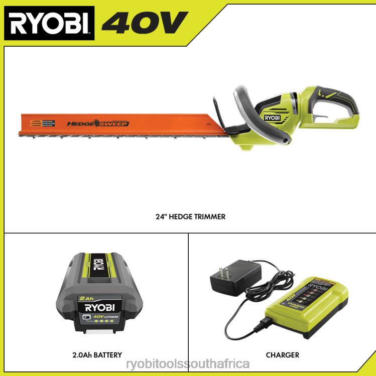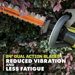 Expand your 40V system with the 40V 24” Hedge Trimmer Kit. RYOBI 40V technology delivers more power than a 19cc gas hedge trimmer, making it a true gas replacement without the hassle of gas or cords. Trim for up to 46 minutes of runtime with the included 40V 2Ah lithium battery. The 24” blades and a 1” cut capacity tackle thick hedges with ease, delivering gas performance with just the pull of a trigger, without the hassle of gas or cords. Plus, the rotating handle allows you to comfortably trim hedges and shrubs at all angles, while the HEDGESWEEP Debris Remover quickly and easily removes clippings as you work. Dual action blades reduce vibration and fatigue, making your trimming experience more comfortable. Best of all, it is part of the RYOBI 40V System where any 40V battery works with any 40V product. This 40V Hedge Trimmer is backed by the RYOBI 5-year manufacturer’s warranty and the included battery is backed by the RYOBI 3-year battery warranty. This kit includes the RY40602 40V Hedge Trimmer, OP40204 40V 2Ah Lithium Battery, OP404 40V Charger, HEDGESWEEP Debris Remover, Scabbard, and Operator’s Manuals.