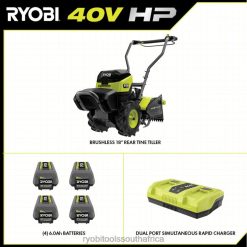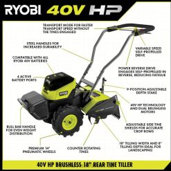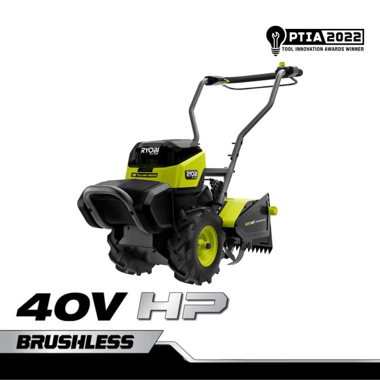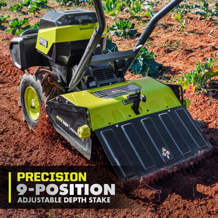 Enter the RYOBI 40V System with the RYOBI 40V HP Brushless 18″ Rear Tine Tiller Kit. 40V HP Technology delivers more power than a 208cc gas tiller, making this tiller a true gas replacement. 40V HP technology combines two brushless motors and counter rotating tines to provide the power to break new ground and tackle tough terrain with an 18” tilling width & 10” tilling depth. With up to 3,000 sq. ft. per charge, the size of 1 tennis court, this tiller is perfect for everything from large gardens to small farms. It’s equipped with variable speed self-propelled providing smoother operation & effortless control, even in reverse. In transport mode, activate self-propel function without engaging the tines. Choose your tilling depth using the 9-position adjustable depth stake, and for protection of surrounding plants & ensuring accurate crop rows, use the adjustable side tine shield. The removable sand ballast & the bull bar allow you to add weight and evenly distribute it. Recharge (2) 40V 6Ah batteries simultaneously in less than 60 minutes with the included 40V Dual-Port Rapid Charger. Best of all, it is part of the RYOBI 40V system where any 40V battery works with any 40V product. This RYOBI 40V HP Brushless 18″ Rear Tine Tiller Kit is backed by the RYOBI 5-Year Manufacturer’s Tool Warranty, 3-Year Manufacturer’s Battery Warranty, and RY40702 40V HP Brushless 18″ Rear Tine Tiller, (4) OP40605 40V 6Ah Lithium Batteries, OP409 40V Dual-Port Rapid Charger, and Operator’s Manuals.