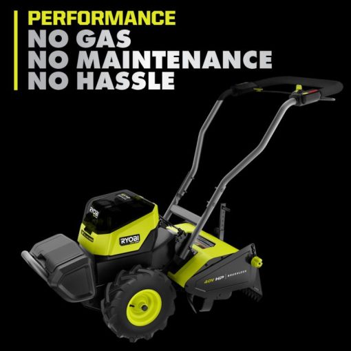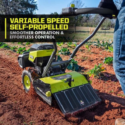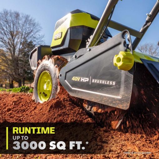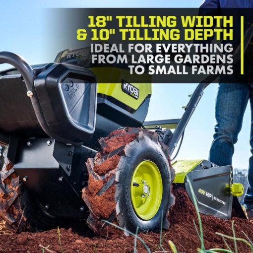 Enter the RYOBI 40V System with the RYOBI 40V HP Brushless 18″ Rear Tine Tiller Kit. 40V HP Technology delivers more power than a 208cc gas tiller, making this tiller a true gas replacement. 40V HP technology combines two brushless motors and counter rotating tines to provide the power to break new ground and tackle tough terrain with an 18” tilling width & 10” tilling depth. With up to 3,000 sq. ft. per charge, the size of 1 tennis court, this tiller is perfect for everything from large gardens to small farms. It’s equipped with variable speed self-propelled providing smoother operation & effortless control, even in reverse. In transport mode, activate self-propel function without engaging the tines. Choose your tilling depth using the 9-position adjustable depth stake, and for protection of surrounding plants & ensuring accurate crop rows, use the adjustable side tine shield. The removable sand ballast & the bull bar allow you to add weight and evenly distribute it. Recharge (2) 40V 6Ah batteries simultaneously in less than 60 minutes with the included 40V Dual-Port Rapid Charger. Best of all, it is part of the RYOBI 40V system where any 40V battery works with any 40V product. This RYOBI 40V HP Brushless 18″ Rear Tine Tiller Kit is backed by the RYOBI 5-Year Manufacturer’s Tool Warranty, 3-Year Manufacturer’s Battery Warranty, and RY40702 40V HP Brushless 18″ Rear Tine Tiller, (4) OP40605 40V 6Ah Lithium Batteries, OP409 40V Dual-Port Rapid Charger, and Operator’s Manuals.
