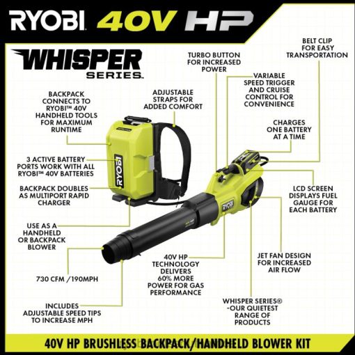Enhance your 40V System with the 40V HP Cordless Jet Fan Blower Kit. Using 40V HP technology and a jet fan design, this blower delivers more power than a 27cc gas blower, making it a true gas replacement. This blower runs for up to 30 minutes when paired with the (2) included 40V 6Ah lithium batteries. 40V HP technology combines a brushless motor, advanced electronics, and high performance lithium technology to deliver 730 CFM and 190 MPH, making it ideal for tackling tough jobs like wet leaves and heavy lawn debris. The Whisper Series blower is engineered to be 86% quieter than gas, and even quieter than other cordless blowers, allowing you to work anytime without disturbing others. Experience gas performance with just the pull of a trigger. No gas, no maintenance and no hassle. The variable speed trigger and turbo button give you complete control of the output of air, so you can dial back when in delicate areas and engage the turbo button for clearing tougher debris. With two customizable speed tips for increased air speed and compatibility with other accessories, this blower provides ultimate versatility for your landscaping needs. Best of all, it is part of the RYOBI 40V System where any 40V battery works with any 40V product. This 40V HP Blower kit is backed by the RYOBI 5-year manufacturer’s warranty and 3-year manufacturer’s battery warranty. This kit includes the RY404010 40V Jet Fan Blower, (2) OP40605 40V 6Ah Lithium Batteries, OP40BPA 40V Integrated Charger, Blower Tube, (2) Speed Tips, and Operator’s Manuals.