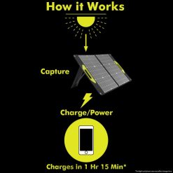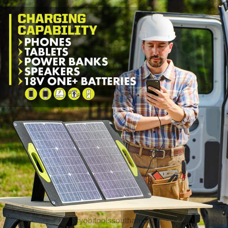 The RYOBI 60 Watt Foldable Solar Panel powers any small electronic device with a USB-A or USB-C port directly from the sun. For added compatibility, it also powers a variety of other electronics with the barrel plug connector and adaptors. It is ideal for powering your phones, tablets, power banks, speakers, and even your RYOBI 18V ONE+ batteries when combined with a compatible RYOBI power source. Pair with the RYOBI 18V ONE+ RYi818BG Power Station to charge up to 8 batteries consecutively using solar power. This Solar Panel can charge a RYOBI 18V ONE+ 2Ah battery in under 1 hour and your phone in as little as 1 hour and 15 minutes. The compact, foldable design makes storing and transporting easy, so you can take it with you to charge devices when camping, on a jobsite and anywhere under the sun where you’d need portable power. Maximize the amount of light the panels capture using the freely adjustable kickstand or the (4) secure grommets. The RYOBI 60 Watt Solar Panel is backed by the RYOBI 3-Year Manufacturer’s Warranty and includes the RYi60SP 60 Watt Foldable Solar Panel, Barrel Plug Adaptors and an Operator’s Manual.