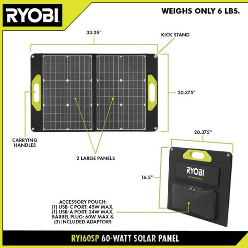The RYOBI 60 Watt Foldable Solar Panel powers any small electronic device with a USB-A or USB-C port directly from the sun. For added compatibility, it also powers a variety of other electronics with the barrel plug connector and adaptors. It is ideal for powering your phones, tablets, power banks, speakers, and even your RYOBI 18V ONE+ batteries when combined with a compatible RYOBI power source. Pair with the RYOBI 18V ONE+ RYi818BG Power Station to charge up to 8 batteries consecutively using solar power. This Solar Panel can charge a RYOBI 18V ONE+ 2Ah battery in under 1 hour and your phone in as little as 1 hour and 15 minutes. The compact, foldable design makes storing and transporting easy, so you can take it with you to charge devices when camping, on a jobsite and anywhere under the sun where you’d need portable power. Maximize the amount of light the panels capture using the freely adjustable kickstand or the (4) secure grommets. The RYOBI 60 Watt Solar Panel is backed by the RYOBI 3-Year Manufacturer’s Warranty and includes the RYi60SP 60 Watt Foldable Solar Panel, Barrel Plug Adaptors and an Operator’s Manual.