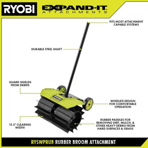 Expand your RYOBI system with the RYOBI EXPAND-IT Rubber Broom Attachment. As part of the RYOBI EXPAND-IT Attachment System, easily transform your attachment capable string trimmer into a rubber broom saving money, time, and space. This rubber broom removes dirt, mulch, & other heavy debris with its rubber paddles from hard surfaces & grass. With a 15.5” clearing width, you can quickly get the job done. It’s equipped with a durable steel shaft, a guard to shield from debris, and wheels for comfortable transport and operation. The RYOBI EXPAND-IT Rubber Broom Attachment is compatible with most gas & cordless attachment capable systems. It’s backed by the RYOBI 3-Year Manufacturer’s Warranty and includes RYSWPRUB Rubber Broom Attachment, J-Handle with Hardware, Wheels, and Operator’s Manual.
