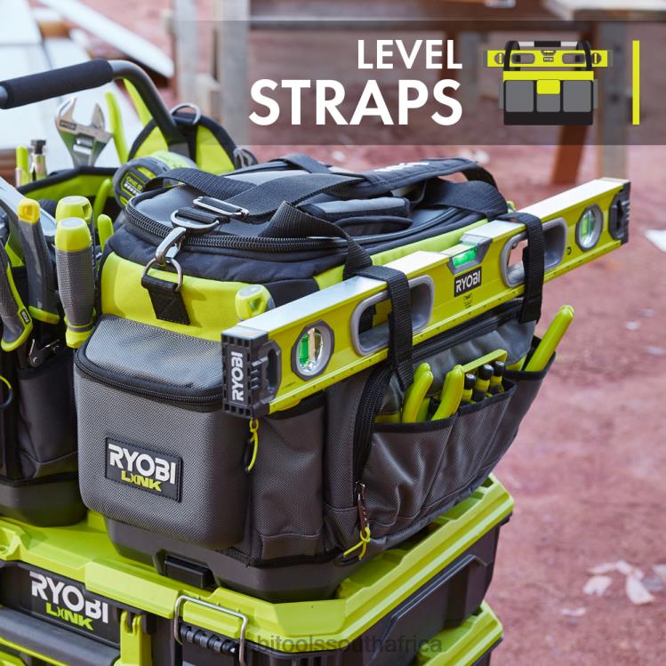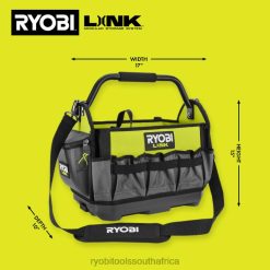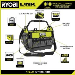 The RYOBI LINK Modular Storage System is revolutionizing the storage industry, enabling you to Organize, Access and Transport your life. The RYOBI LINK 17″ Tool Tote is designed to handle the toughest of situations. The 60 lb. weight capacity, heavy duty 1680D pockets and water resistant material keep your tools protected in transport. Organization is endless with 42 interior and exterior pockets and an adjustable divider. The hard side pocket provides additional protection for phones or glasses while the integrated level straps and tape measure clip keep those items easily reachable. Carry using the top handle or utilizing the included padded shoulder strap. The pivoting handle can be easily stowed out of the way. Best of all, it is part of the RYOBI LINK Modular Storage System line of products that use the same locking technology to seamlessly connect your mobile and stationary storage needs. Own your space with RYOBI LINK Modular Storage System.