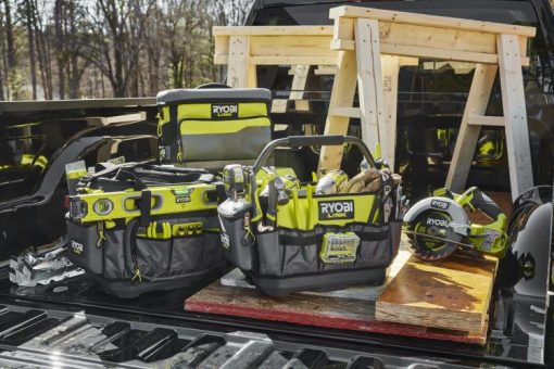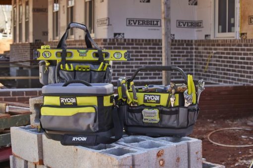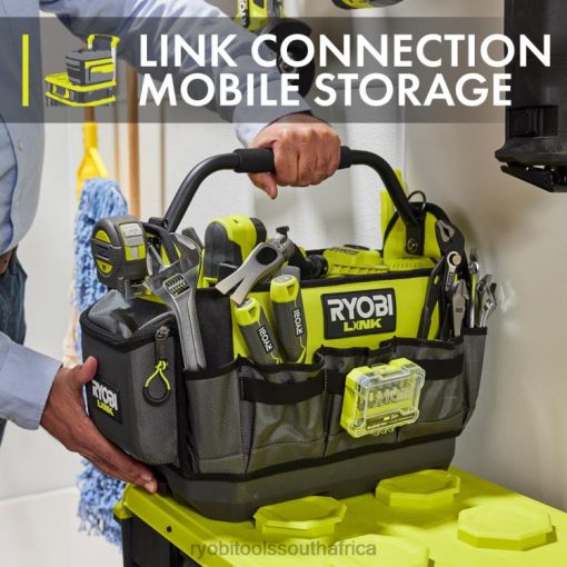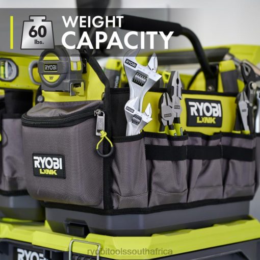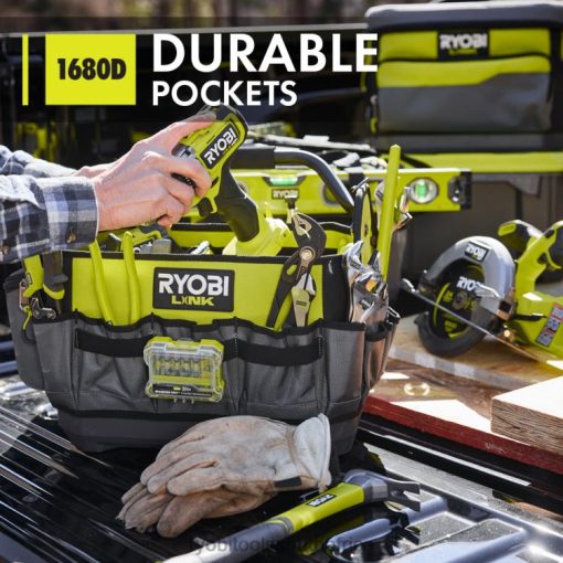 The RYOBI LINK Modular Storage System is revolutionizing the storage industry, enabling you to Organize, Access and Transport your life. The RYOBI LINK 17″ Tool Tote is designed to handle the toughest of situations. The 60 lb. weight capacity, heavy duty 1680D pockets and water resistant material keep your tools protected in transport. Organization is endless with 42 interior and exterior pockets and an adjustable divider. The hard side pocket provides additional protection for phones or glasses while the integrated level straps and tape measure clip keep those items easily reachable. Carry using the top handle or utilizing the included padded shoulder strap. The pivoting handle can be easily stowed out of the way. Best of all, it is part of the RYOBI LINK Modular Storage System line of products that use the same locking technology to seamlessly connect your mobile and stationary storage needs. Own your space with RYOBI LINK Modular Storage System.