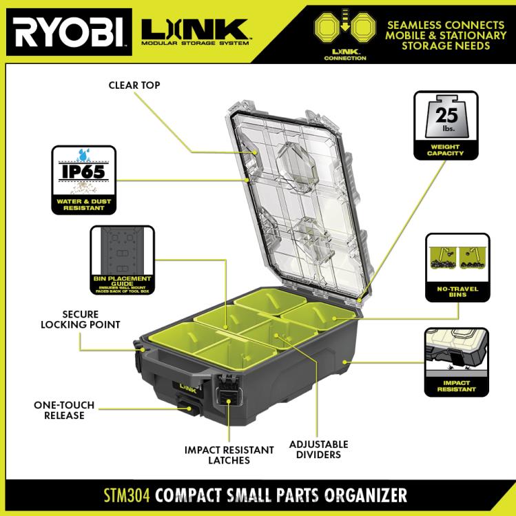 The RYOBI LINK Modular Storage System is revolutionizing the storage industry, enabling you to Organize, Access and Transport your life. The RYOBI LINK CompactSmall Parts Organizer provides tool storage in the toughest of situations, fully equipped with impact resistant material and a 25 lb. load capacity. Secure your portable tool storage with the IP65 rated which protects your items from water and dust in any environment. The integrated hand tool compartment and no-travel organizer bins provide maximum RYOBI tool storage organization, keeping everything in its place. Quickly identify what’s inside with the clear top and secure your items with a locking point. This is the perfect addition to your mobile tool box line up. Best of all, it is part of the RYOBI LINK Modular Storage System line of products that use the same locking technology to seamlessly connect your mobile and stationary storage needs. Own your space with RYOBI LINK Modular Storage System.