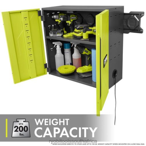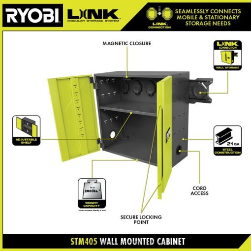 The RYOBI LINK Modular Storage System is revolutionizing the storage industry, enabling you to Organize, Access and Transport your life. The RYOBI LINK Wall Mounted Cabinet is designed to maximize your garage or workshop space. The LINK compatible design easily hangs on a LINK Wall Rail or can be mounted directly to studs. The 200 lb. weight capacity and 21 GA steel body provide increased durability. The 6 position adjustable shelf allows you to customize to your tool collection. The integrated cord access ensures protection of your batteries and chargers. Easily secure your items with a locking point and magnetic door closure. Best of all, it is part of the RYOBI LINK Modular Storage System line of products that use the same locking technology to seamlessly connect your mobile and stationary storage needs. Own your space with RYOBI LINK Modular Storage System.